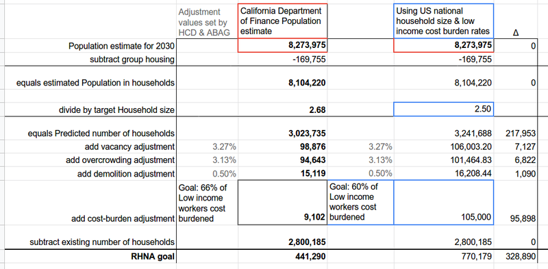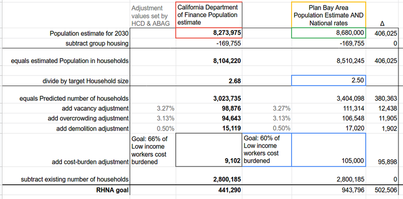 Over the last few months, HCD and ABAG staff members discussed which inputs to use in this formula, but their choices were not revealed until this week. Adjusting these inputs to be more realistic causes this number to be as high as 900,000 or even above 1,000,000 (where “population in 2030,” “number of people in each household,” and “target cost burdened rates,” are the most impactful factors).