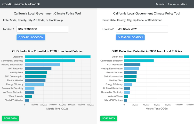 Urban infill is the top measure for reducing 2030 emissions from local policy in the Coolclimate scenarios for San Francisco and Mountain View. (c/o Coolclimate)